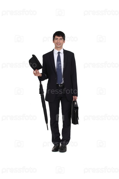 Бизнесмен с зонтом и шляпой