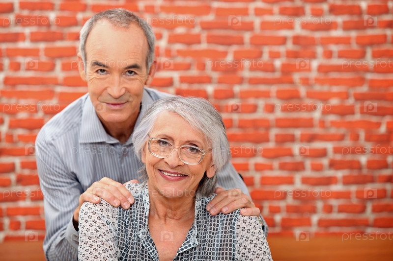 Пожилая пара перед кирпичной стеной