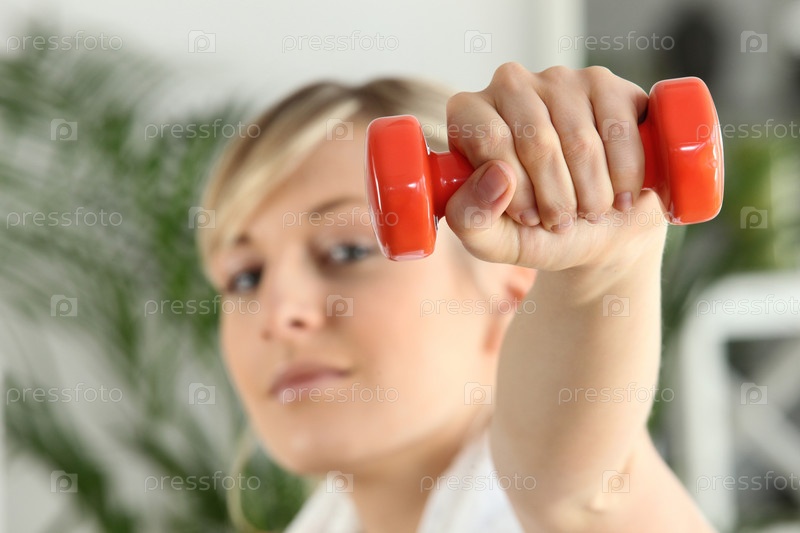 Блондинка с оранжевой гантелью