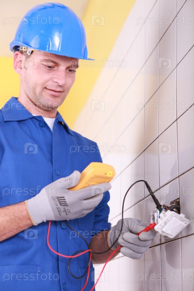 Электрик проверяет выход с амперметром