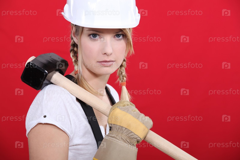 Женщина-рабочий держит кувалду