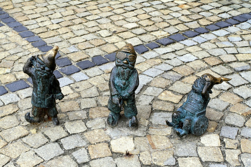 Три бронзовых статуэтки гномов (краснолюдки), г. Вроцлав, Польша, Европа