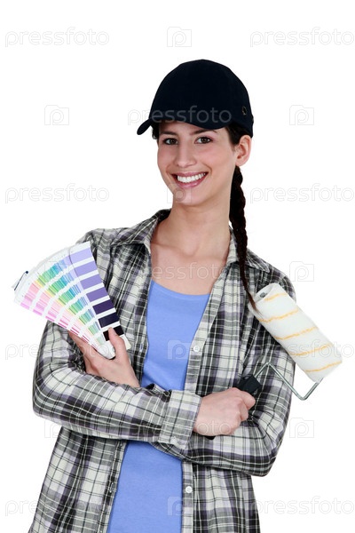 Женщина-маляр с валиком и палитрой красок