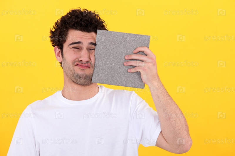 Мужчина прижимает плитку к лицу