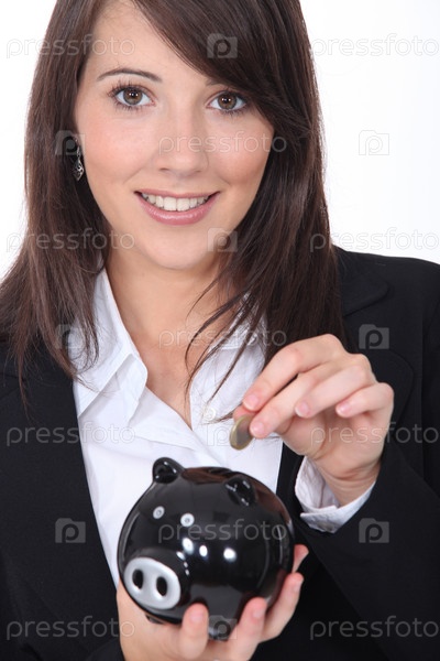 Молодая женщина кладет монету в копилку