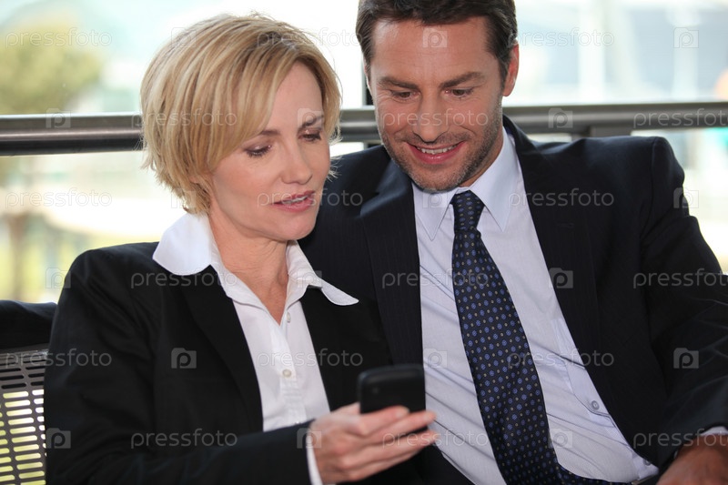 Деловые мужчина и женщина, глядящие на телефон