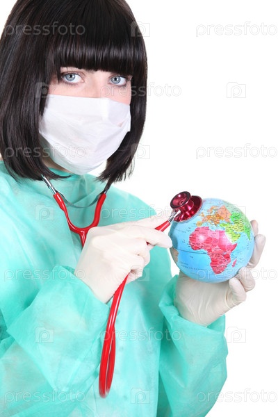 Врач слушает глобус стетоскопом