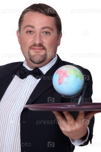 Элегантный мужчина с глобусом на подносе