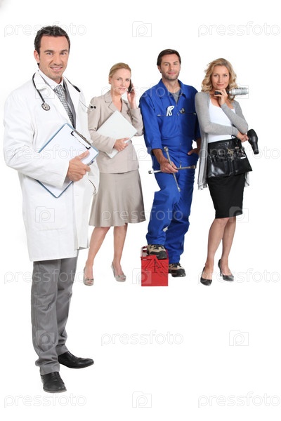 Доктор со стетоскопом, секретарь, рабочий и парикмахер
