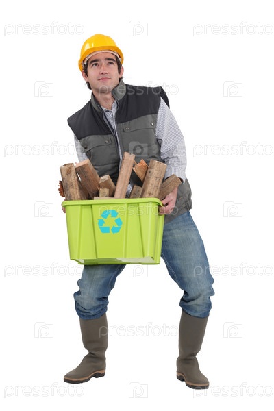 Мужчина с трудом несет ящик с отходами на переработку