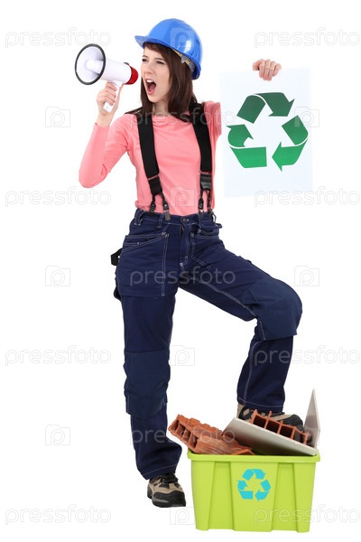 Рабочая с мегафоном и знаком утилизации