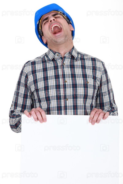 Кричащий строитель с доской для вашего сообщения