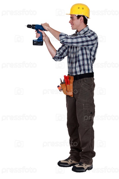 Молодой мастер работает с дрелью