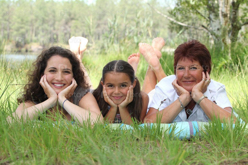 Семья лежит в парке