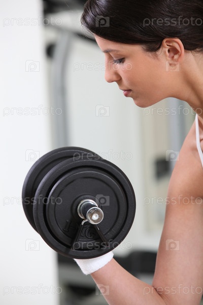 Женщина поднимает гантели