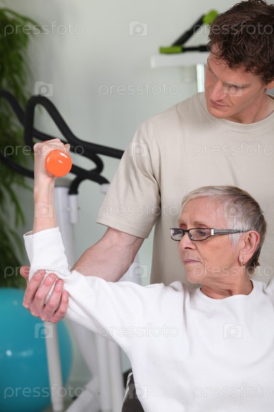 Пожилая женщина поднимает гантели с фитнес-тренером