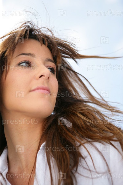 Женщина с развевающимися на ветру волосами