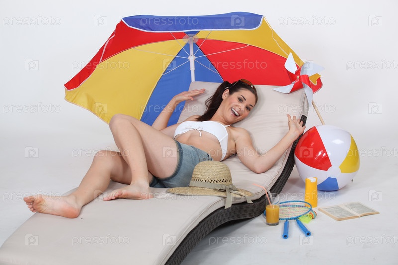 Привлекательная женщина на шезлонге на пляже