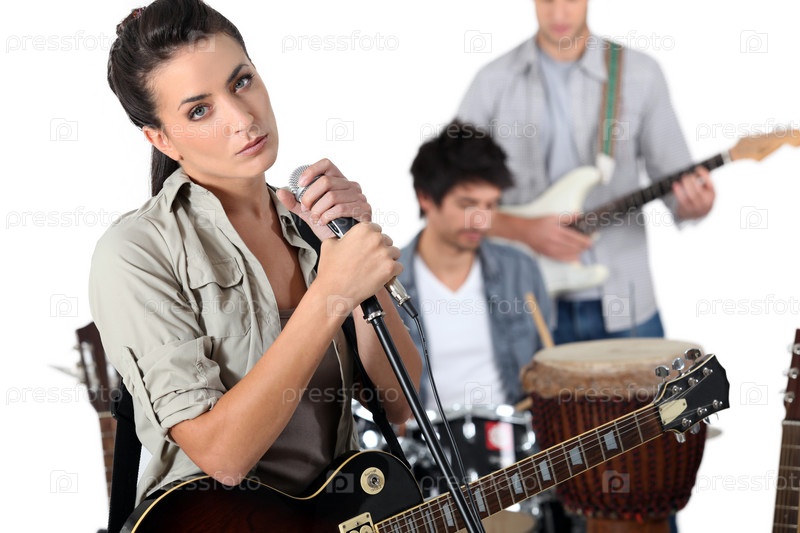 Певица брюнетка с микрофоном и музыканты в фоновом режиме