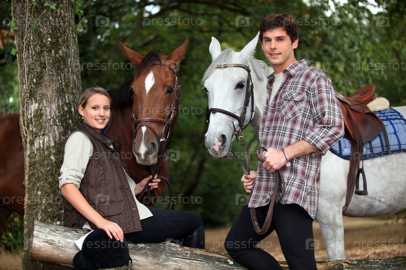 Молодая пара с двумя лошадьми