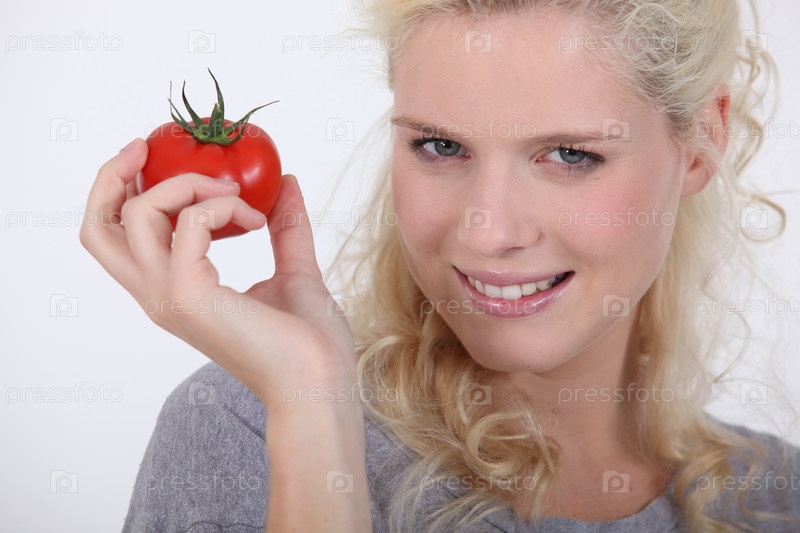 Блондинка с помидором в руке
