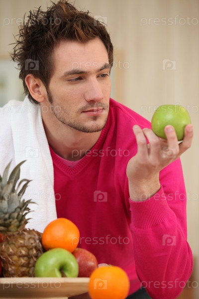 Молодой человек выбирает яблоко из фруктов