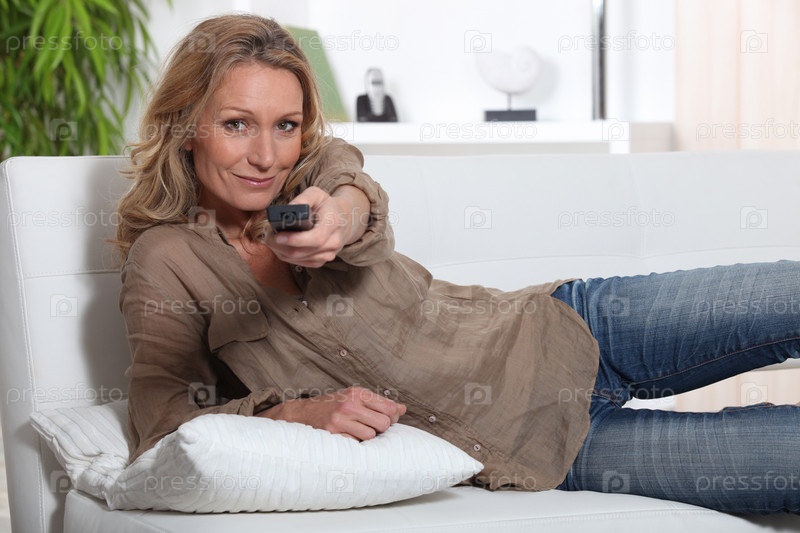 Женщина лежит на диване с пультом дистанционного управления