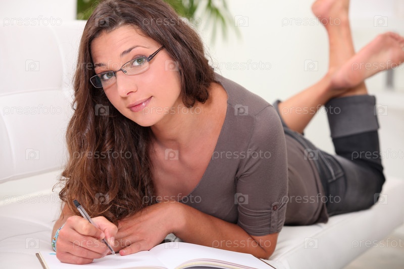 Босая молодая женщина в очках лежит на диване и делает заметки в блокнот