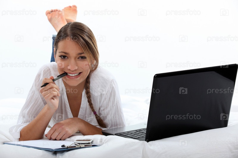 Женщина работает на кровати