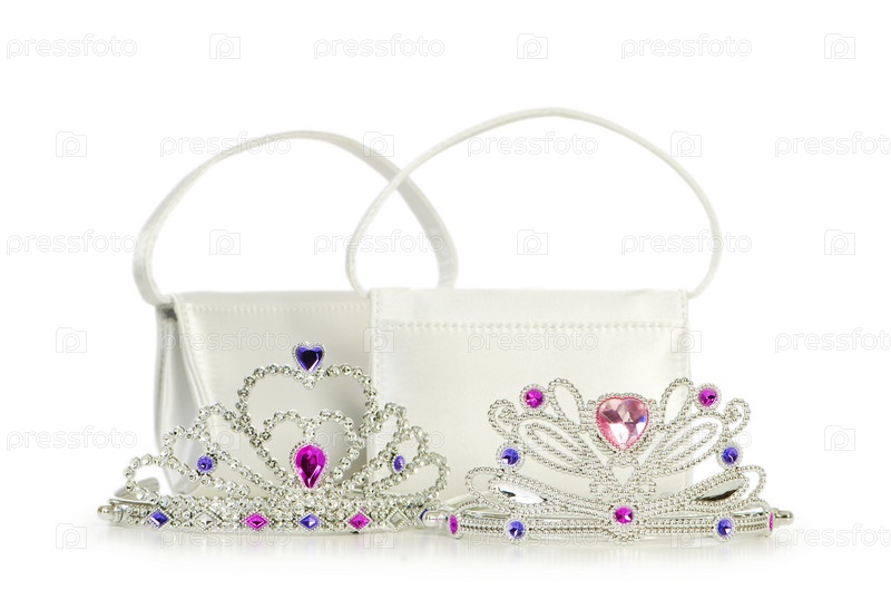 Женские сумочки и диадемы на белом фоне