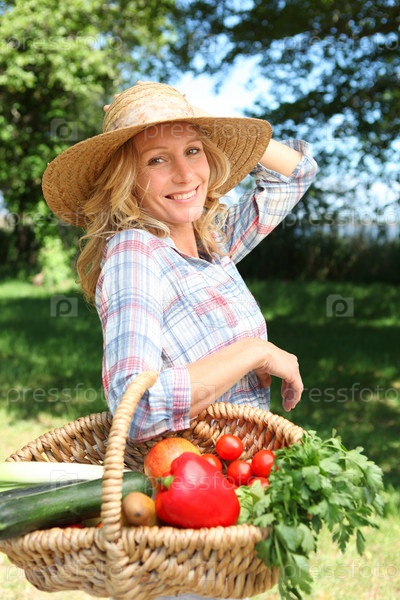 Женщина в соломенной шляпе с корзиной овощей