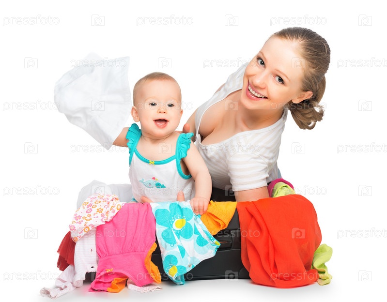 Мама и ребенок с чемоданом и одеждой готовы к поездке в отпуск