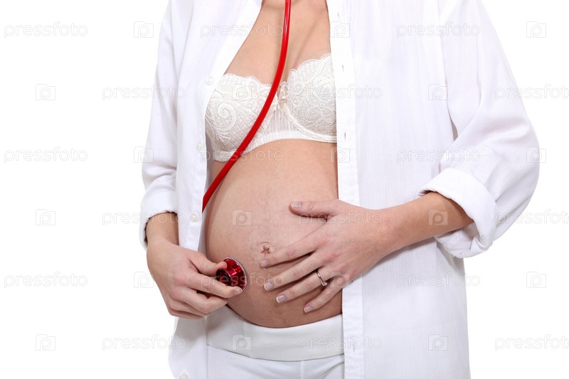 Беременная женщина слушает ребенка стетоскопом
