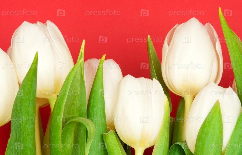 Белые тюльпаны на красном фоне