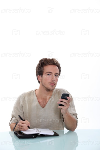 Молодой человек пишет в ежедневнике