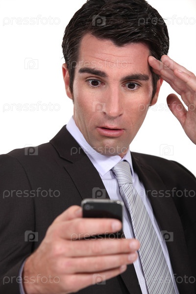 Ошеломленный бизнесмен читает текстовое сообщение