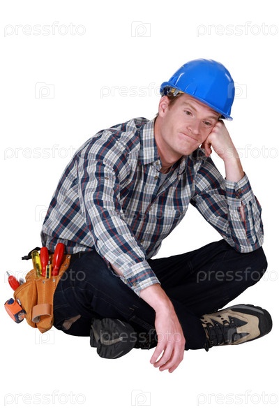 Скучающий чернорабочий сидит, скрестив ноги