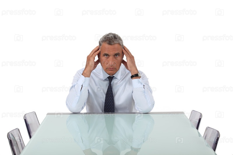 Пожилой бизнесмен сидит в пустом зале для заседаний