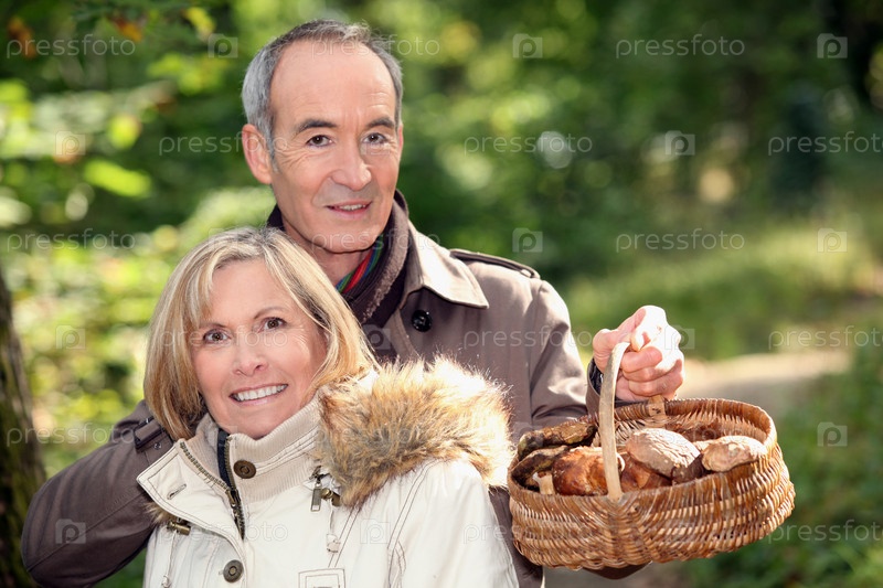 Пара собирает грибы в корзину