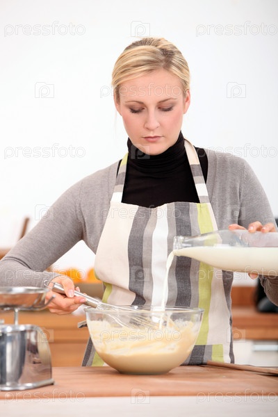Женщина взбивает смесь в кухне