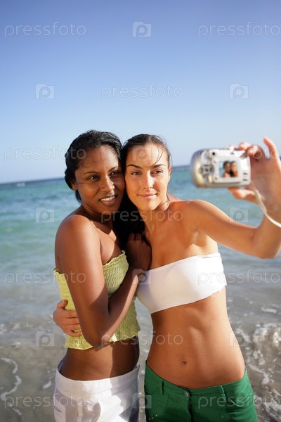 Две подруги делают автопортрет на пляже