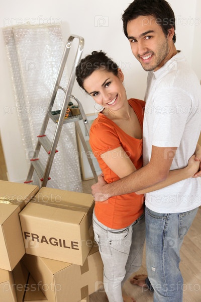 Пара с коробками с надписью "хрупкое"