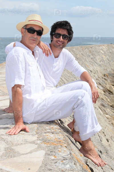 Отец и сын сидя на стене