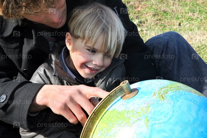 Отец и сын смотрят на глобус