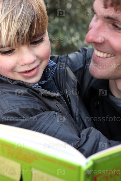 Отец и сын читают книгу на открытом воздухе