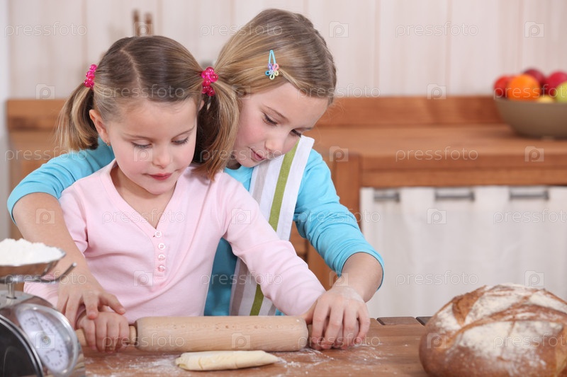 Сестры раскатывают тесто скалкой
