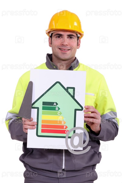 Строитель держит шпатель, таблицу эффективного энергопотребления и знак электронной почты