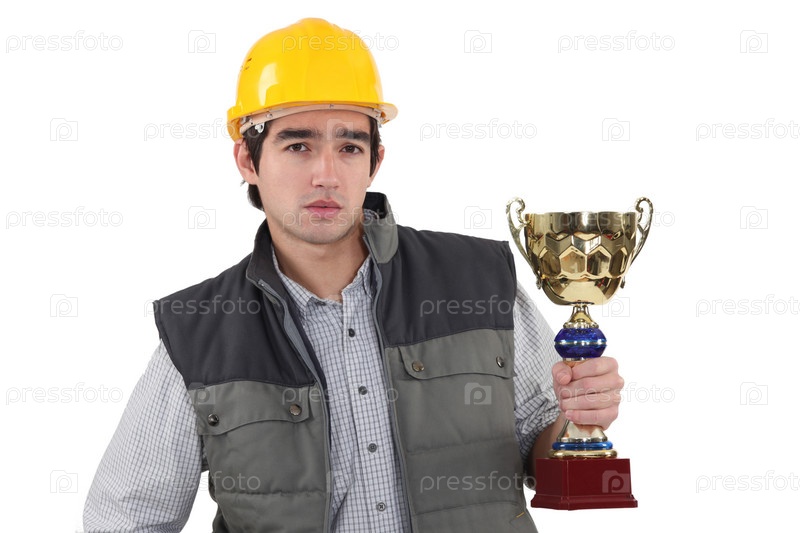 Рабочий держит золотой кубок