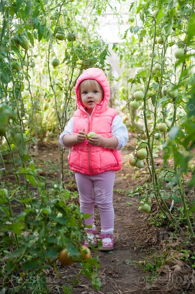 Красивая девочка в теплице с помидорами