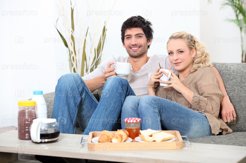 Пара завтракает на диване